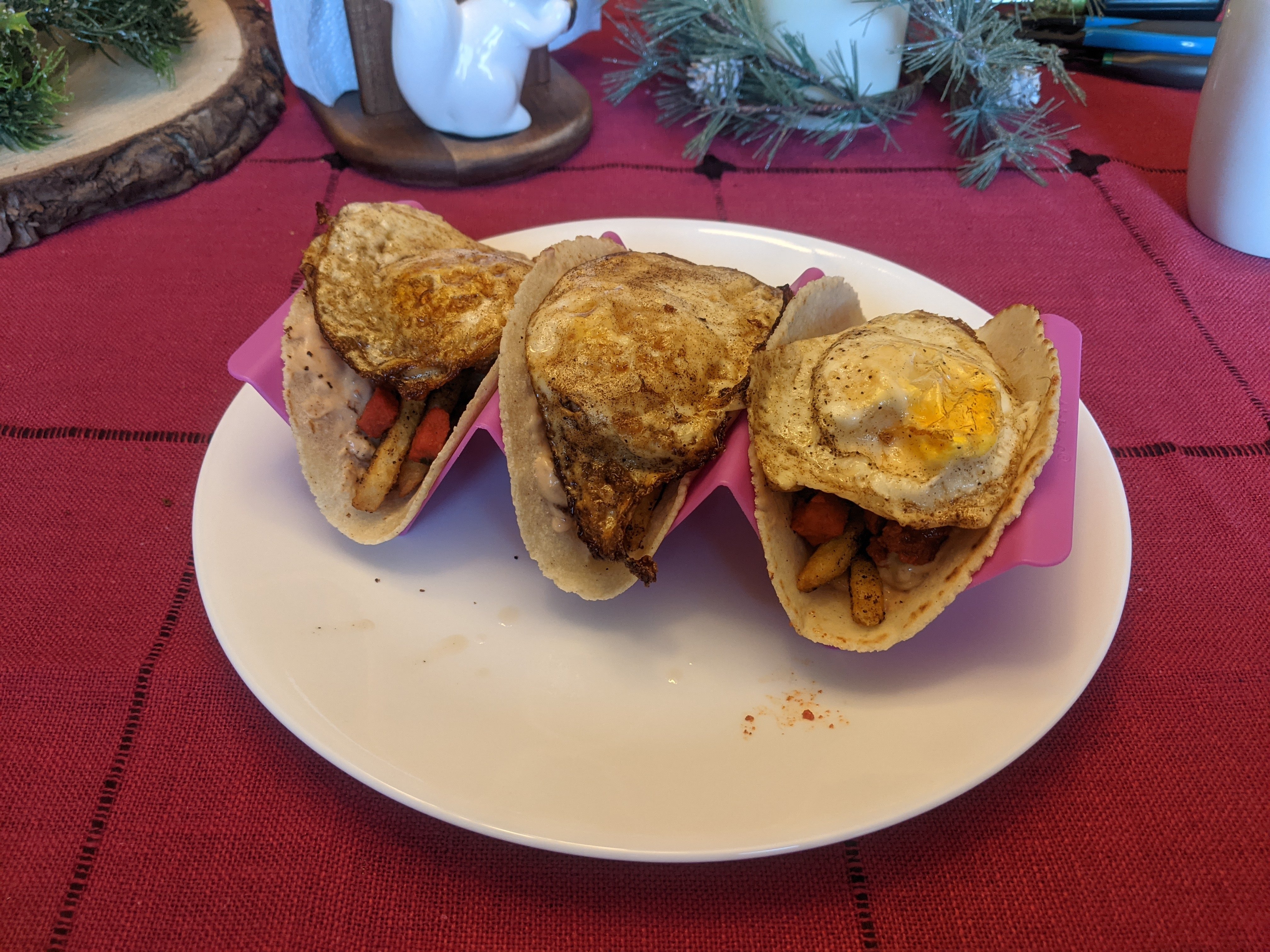 Leftover Al Pastor, seasoned potatoes (I seasoned up some fries to speed things up) chipotle creme, fried egg, hot sauce to taste